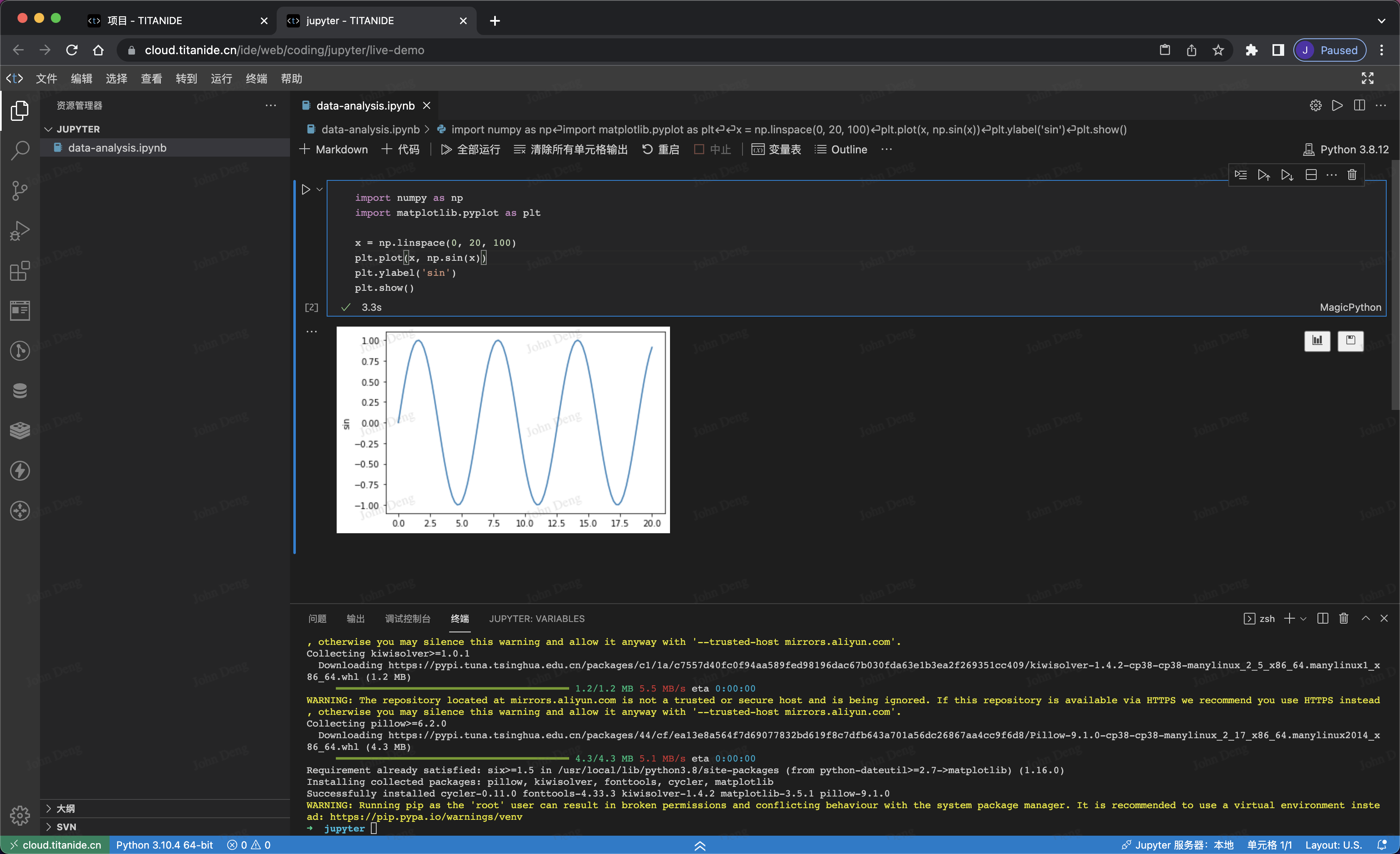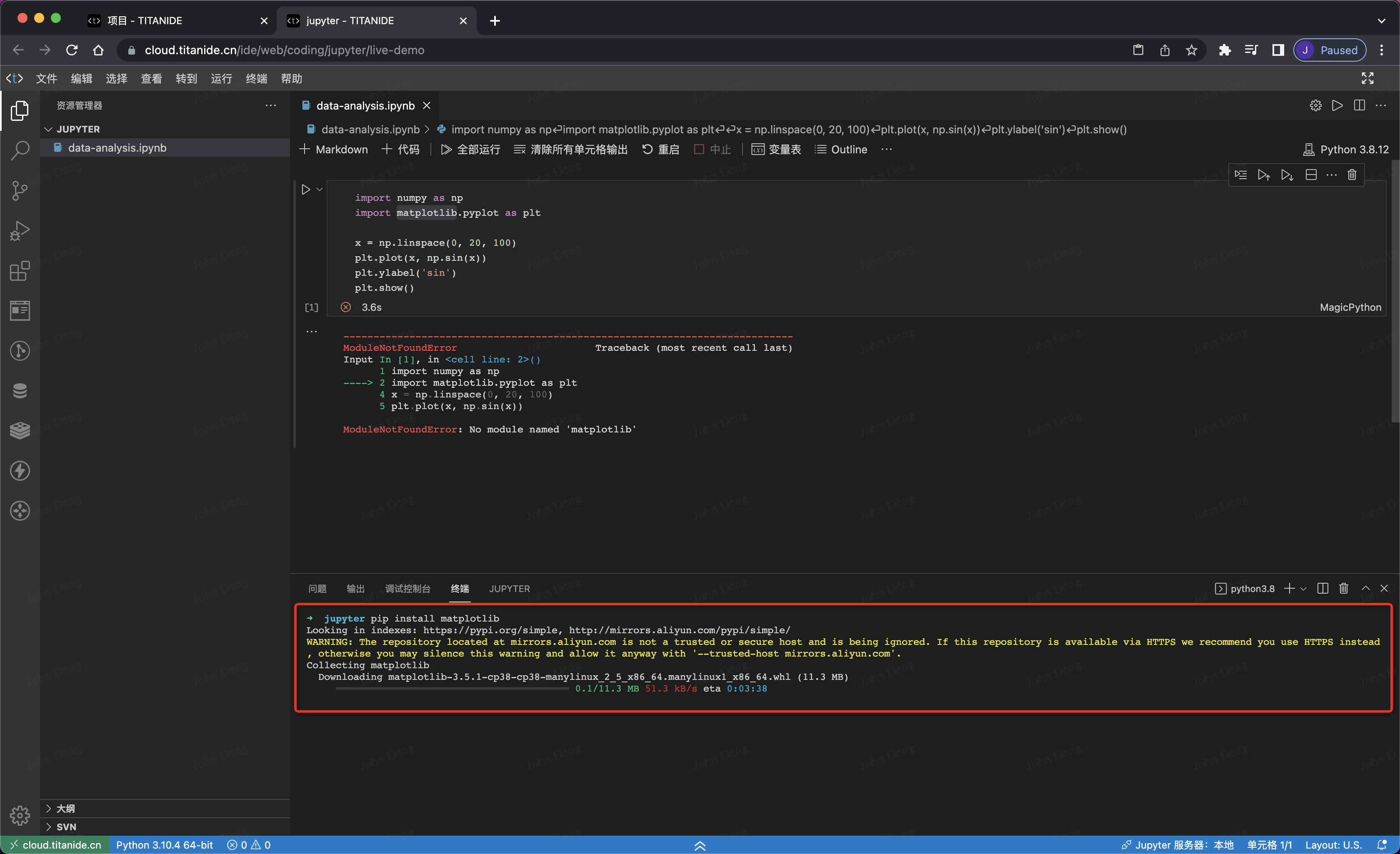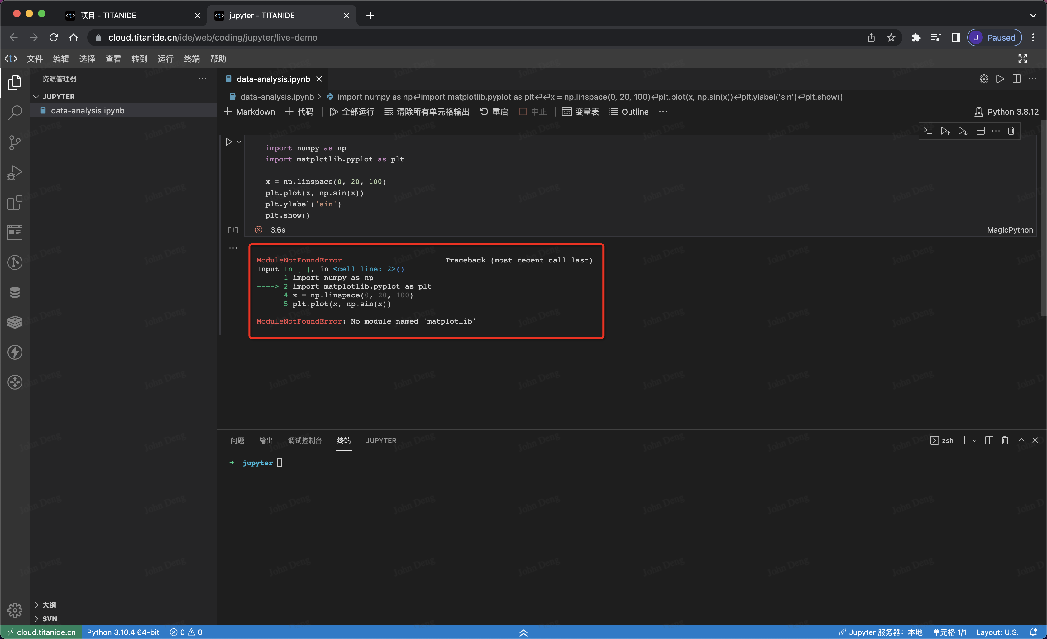 在 Jupyter 代码单元格编写代码,在这里,我们将输出一个正玄波。第一次运行会提升模组未安装的错误信息: