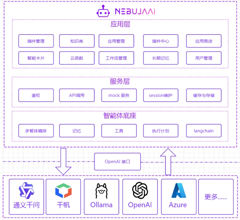 NebulaAI 支持对接各种大语言模型,涵盖本地私有大模型、国内领先的公有大模型和国外知名的公有大模型等,我们提供灵活对接接口,满足企业不同业务场景的需求。