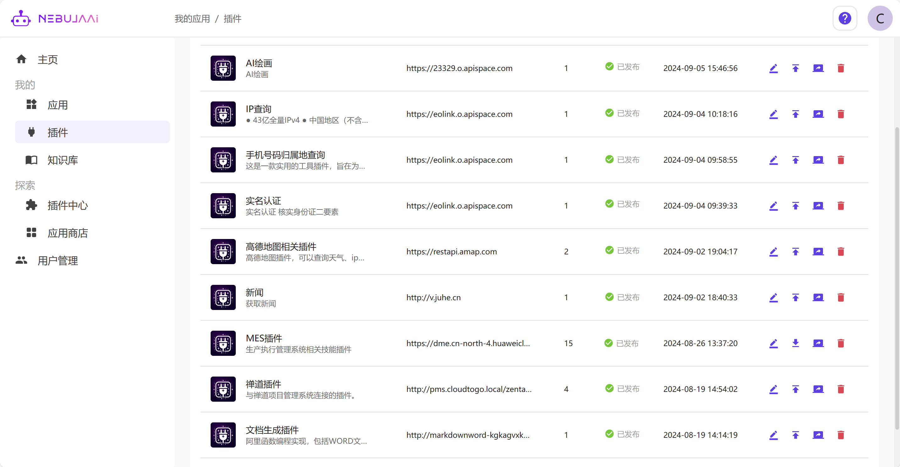 目前 NebulaAI 支持自定义添加多款插件,延伸拓展大模型技能,赋予智能应用专属的超能力。