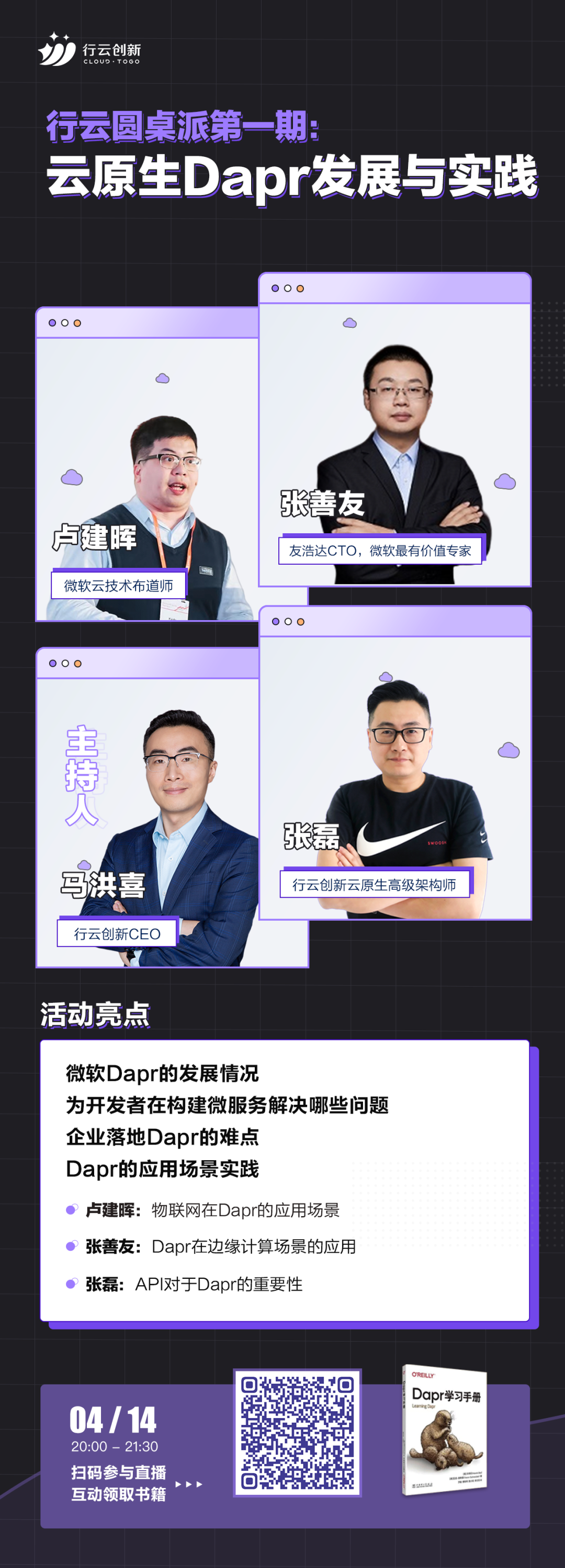 4月14日晚上8点,《行云圆桌派第一期:云原生Dapr的发展与实践》直播来啦!活动由星空XK·(中国)体育创新CEO马洪喜,微软最有价值专家、.NET技术专家张善友,微软云技术布道师卢建晖,星空XK·(中国)体育创新云原生架构师张磊四位嘉宾与大家聊聊Dapr的发展情况和落地遇到的问题、Dapr应用场景实践、未来展望等。