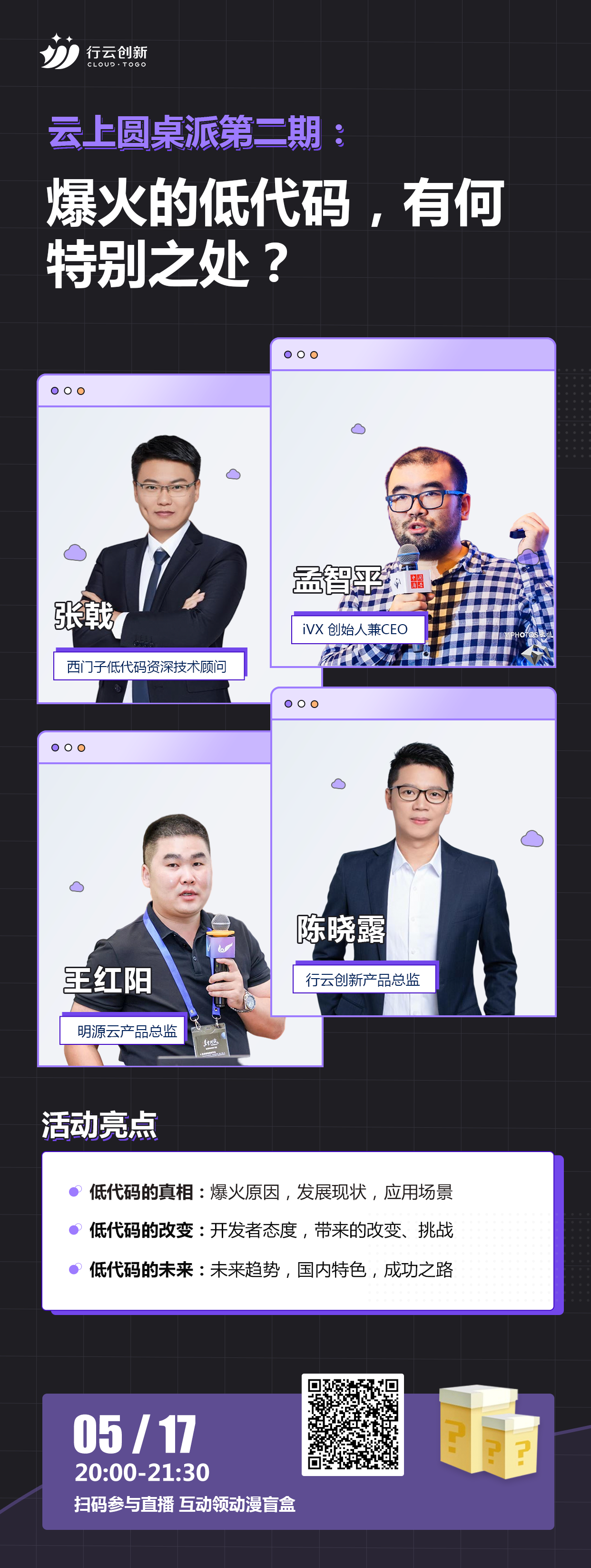 5月17日20:00《云上圆桌派第二期:爆火的低代码,有何特别之处》直播来啦!活动邀请西门子工业软件西门子低代码资深技术顾问张戟,iVX 创始人兼CEO孟智平,明源云产品总监王红阳,星空XK·(中国)体育创新产品总监陈晓露四位大咖和星空XK·(中国)体育创新CEO马洪喜一起对低代码爆火背后的原因、开发者对低代码的态度、低代码带来的变化和应用场景等多个话题展开讨论。