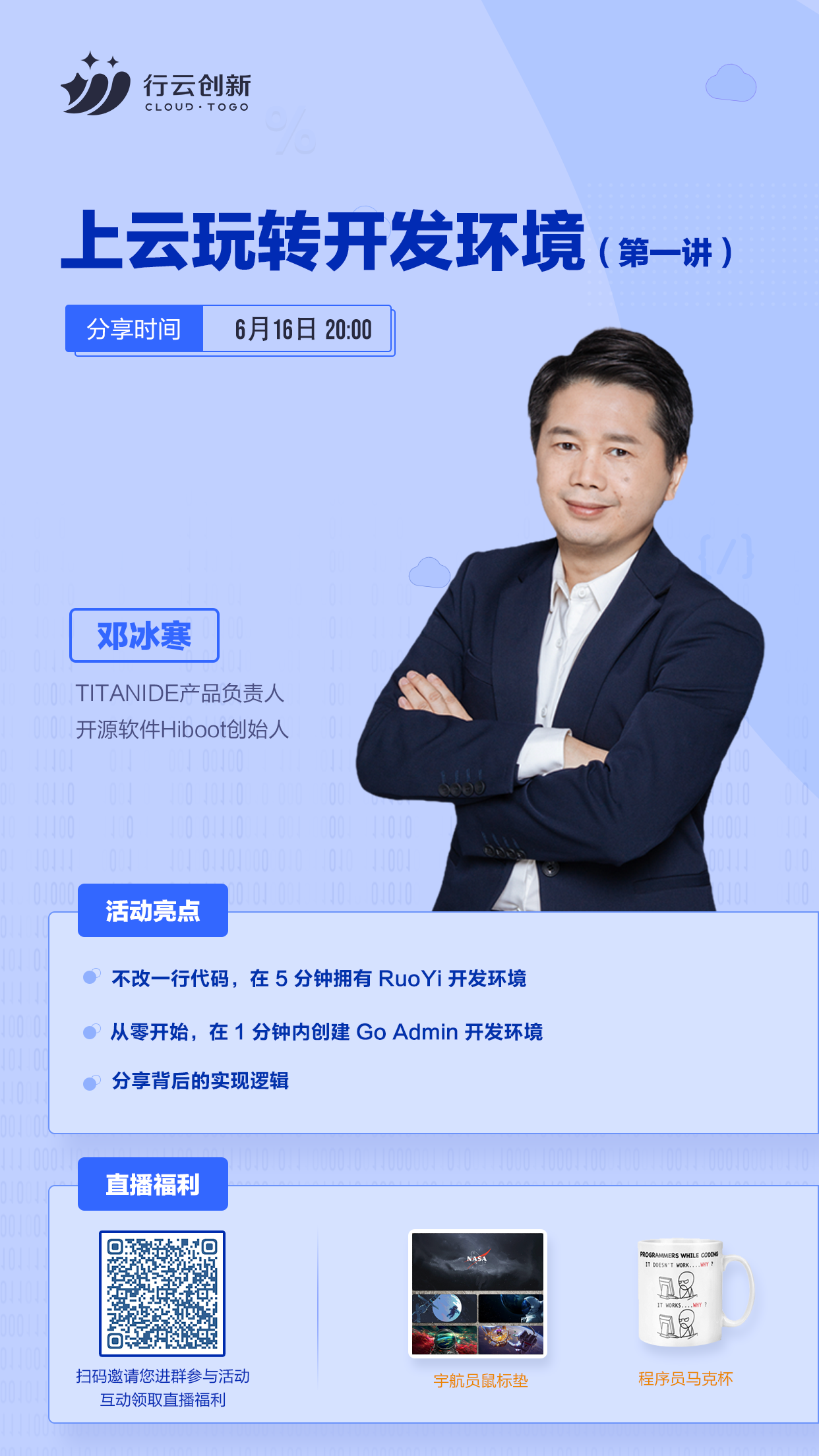 6月16日20:00,“上云玩转开发环境”第一讲即将开启!星空XK·(中国)体育创新 TitanIDE 产品负责人邓冰寒将分享:如何利用 TitanIDE 在不改一行代码情况下,在5分钟拥有 RuoYi 开发环境;如何从零开始,在1分钟内创建 Go Admin 开发环境;以及分享这背后的实现逻辑。直播间还会送出宇航员鼠标垫、程序员马克杯等福利,快扫码参与活动吧~